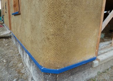 De retour chez Muriel et Serge-Patrick quelques semaines après la pose des bottes, une nouvelle équipe s’est retrouvée pour cette fois préparer et poser les corps d’enduit de la maison. En intérieur, simplement à base d’une terre récupérée dans une carrière proche (la terre du terrain ne convenant pas) ; à l’extérieur, le même mélange avec un peu de chaux (15% environ) pour permettre un meilleure liaison avec les futurs enduits de finition qui seront en chaux-sable. Ici, c’est en priorité le corps d’enduit extérieur qui a été réalisé, pour protéger la maison des intempéries. Les huisseries étant vers l’extérieur des murs, les cadres sont laissés légèrement sortants du mur, avec un solin aux linteaux (comme en bas des murs) pour protéger de l’eau. Quelques reliefs ont été créés en extérieur comme en intérieur.