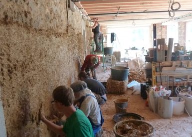 Laure et Pierre ont décidé d’abattre deux murs très abîmés de cette ancienne maison en pierres (façade Sud et pignon Est). Ils les ont fait remonter en paille par l’entreprise Bois et paille qui a également refait toute la charpente. Le chantier participatif de deux semaines a réuni une joyeuse équipe pluri-générationnelle. Celle-ci a pu préparer les supports, le corps d’enduit à base de terre argileuse, et le poser sur les murs.