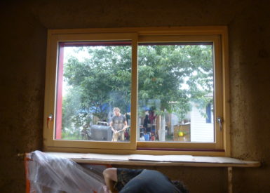 Mais avant cela, il a fallu préparer la paille, la terre et ensuite l’enduit ; mais aussi préparer les murs (ah, les joies de l’étanchéité à l’air !!) et également bien protéger tout ce qui devait l’être : le sol, les huisseries, les tablettes, les solives apparentes…. etc. Ensuite seulement l’équipe a pu être récompensée par la pose de l’enduit et a pu s’exercer les mains et les yeux pour réaliser des enduits le plus plan possible avec des arrondis de bords d’ouvertures.