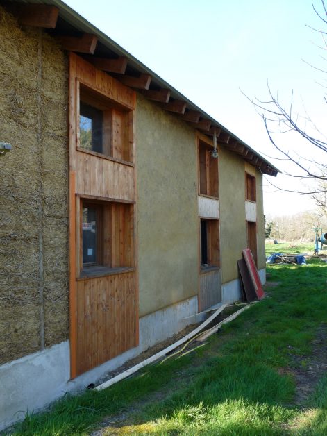Ben et Laure ont choisi d’auto construire leur maison en terre-paille près de Machecoul. Touche à tout, Ben a réalisé la structure lui même et aux vues des sections utilisées pour la charpente, celle-ci ne risque pas de s’effondrer. Ils ont ensuite réalisé le remplissage des murs en terre-paille banché. Après séchage, l’année suivante a été l’occasion d’un chantier pour la réalisation des corps d’enduit terre extérieur. Après une panne mécanique, une partie des enduits a été mélangée par foulage au pied.