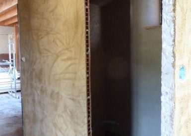 Cette grande maison en paille a bénéficié du concours de l’équipe Les Bois de Paille pour la réalisation de la charpente, ossature, remplissage paille et corps d’enduit. Séverine et Christophe ont fait appel à Botmobil pour les aider dans la réalisation des enduits de finition intérieur. Une petite équipe s’est donc retrouvée pour effectuer les échantillons couleurs, préparer les murs et appliquer les enduits sur différents supports : corps d’enduit mais aussi fermacell et briques plâtrières. Des stucs à base d’argile, parceque plus résistants au frottement et à l’eau ont également été posés sur des endroits spécifiques : mur longeant l’escalier, crédence de lavabo en salle de bain et en cuisine.