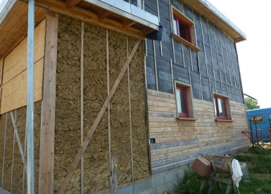 C’est aussi lors de ce chantier que l’équipe a pu s’exercer au montage de murs en terre-paille banché mais aussi, grâce aux connaissances d’un des participants, aux murs en bauge, réalisé ici dans l’appentis au Nord de la maison.