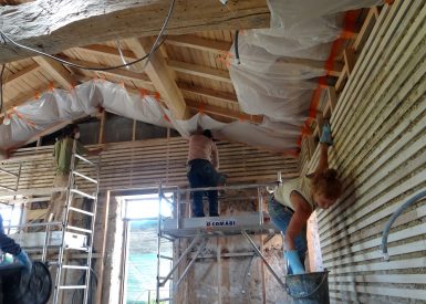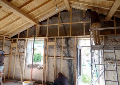 Sur ce chantier, Stéphanie était à la fois intervenante et auto-constructrice. Nous avons participé à la rénovation de sa maison, en réalisant l’isolation des murs en pierres avec de la paille, de la terre allégée, de la chaux et du chanvre.