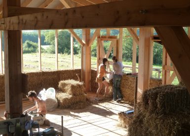 Le chantier participatif a accueilli une petite dizaine de participants qui, pendant 3 semaines, ont rempli l’ossature secondaire de bottes de paille.