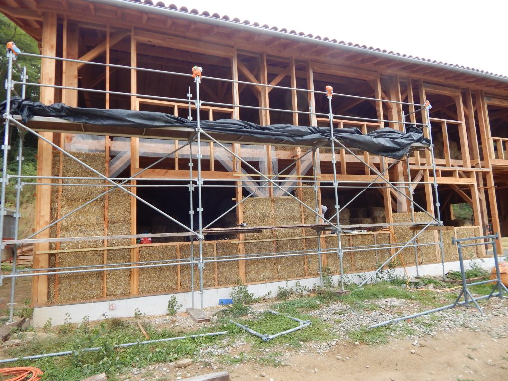 Maintenant c’est l’étape de remplissage des murs en paille du batiment agricole de 160m2.