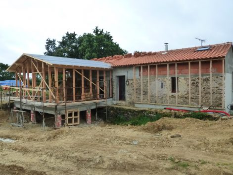 Estelle et Arnaud, en plus de réaliser une Isolation Thermique par l’Extérieur (ITE) en paille de leur maison en pierres, ont décidé d’auto-construire une extension en bottes de paille, afin d’accueillir l’agrandissement de la famille. Pour cette extension, ils ont fait appel à un charpentier local puis à Botmobil pour la pose des bottes et des enduits.